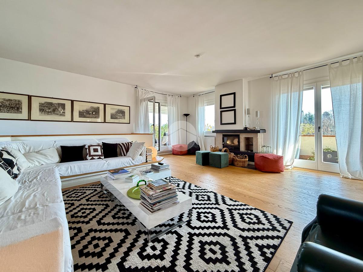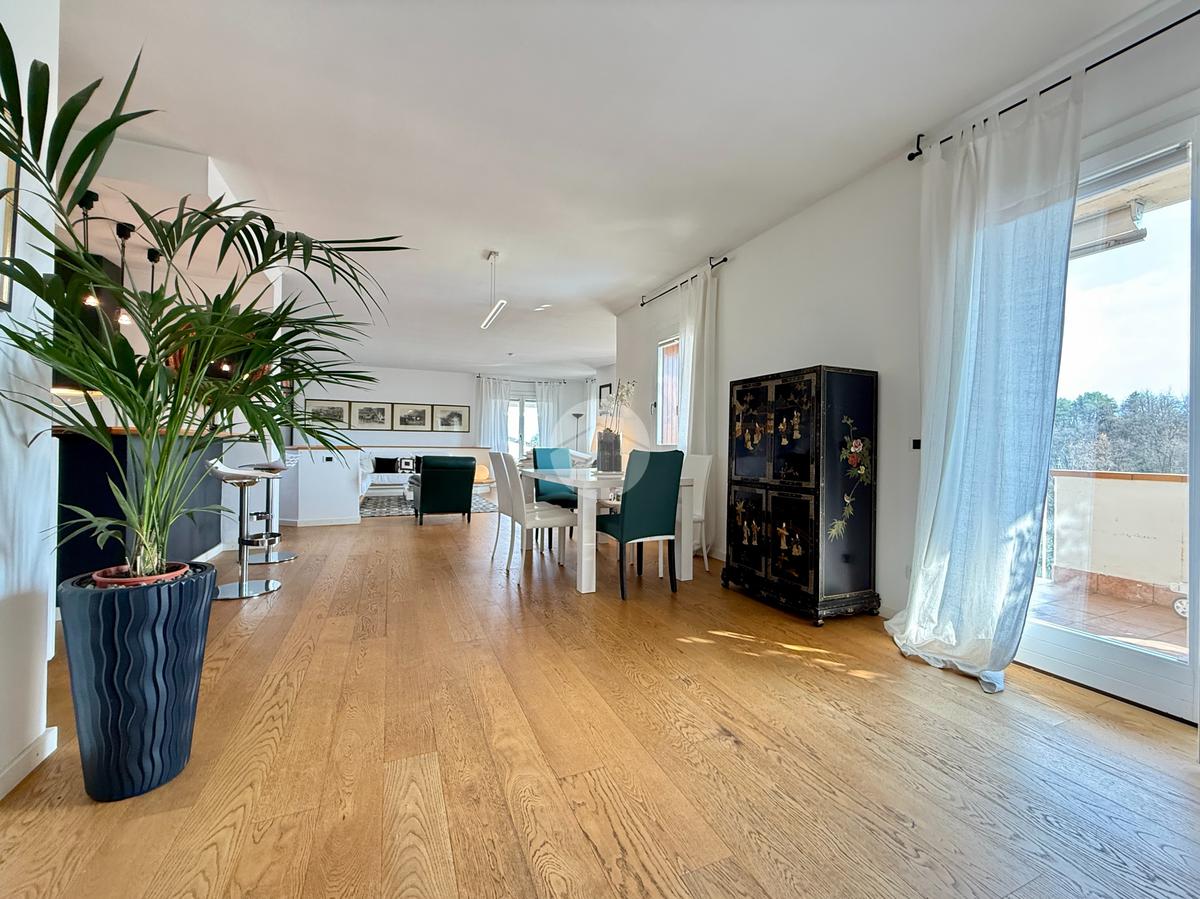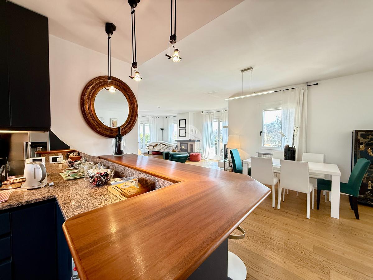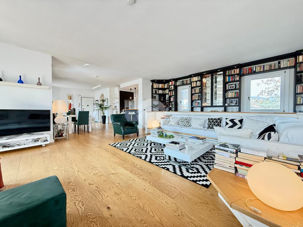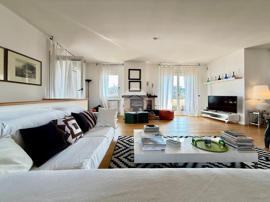Attico di 250mq su due piani: salone di 100mq con camino e terrazza panoramica; 3 camere matrimoniali, 3 bagni, 2 terrazzi, cantina e box doppio.
