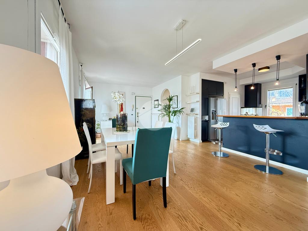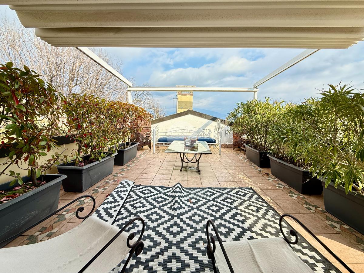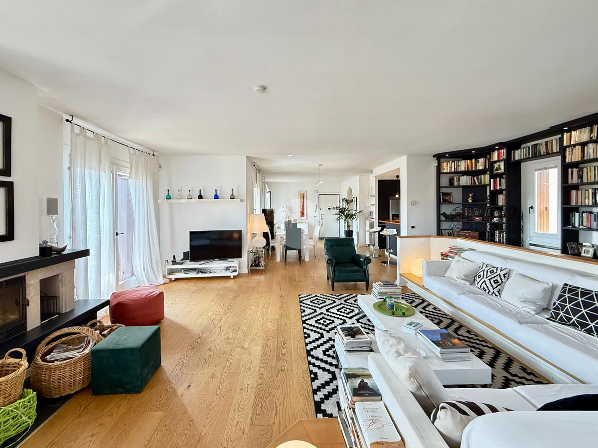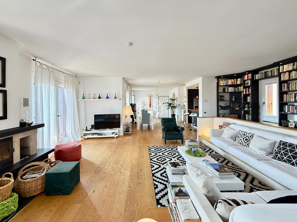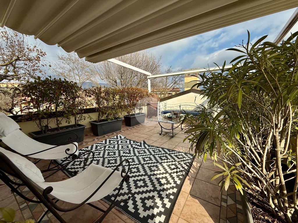 Attico di 250mq su due piani: salone di 100mq con camino e terrazza panoramica; 3 camere matrimoniali, 3 bagni, 2 terrazzi, cantina e box doppio.