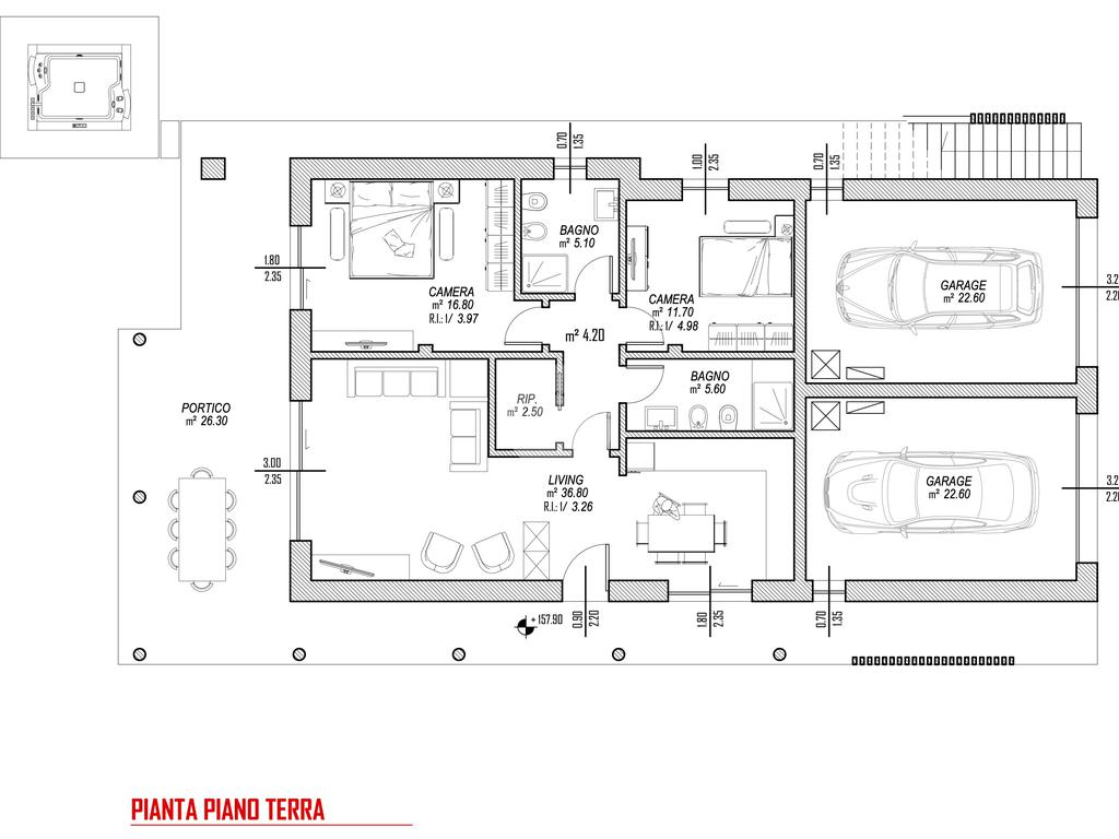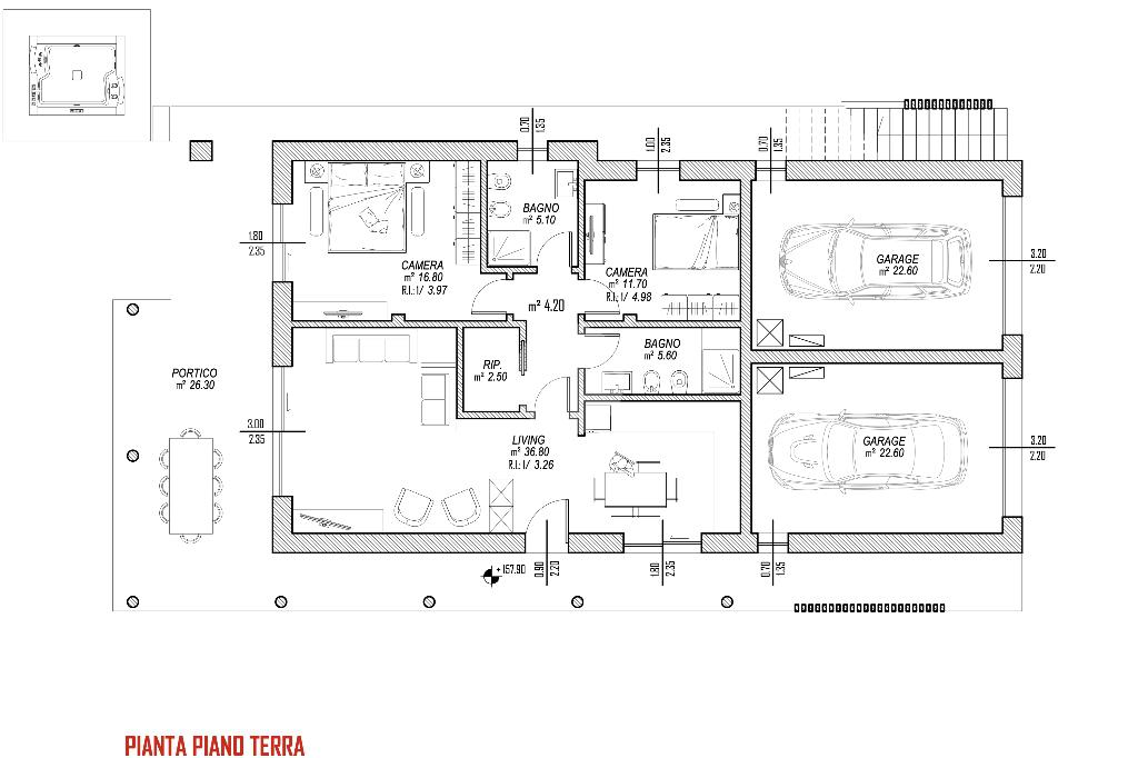 Sempre al piano troviamo due camere da letto (matrimoniale e doppia), due bagni, un pratico disimpegno ed un comodo garage.