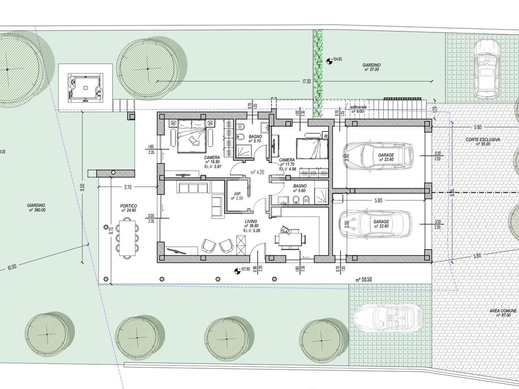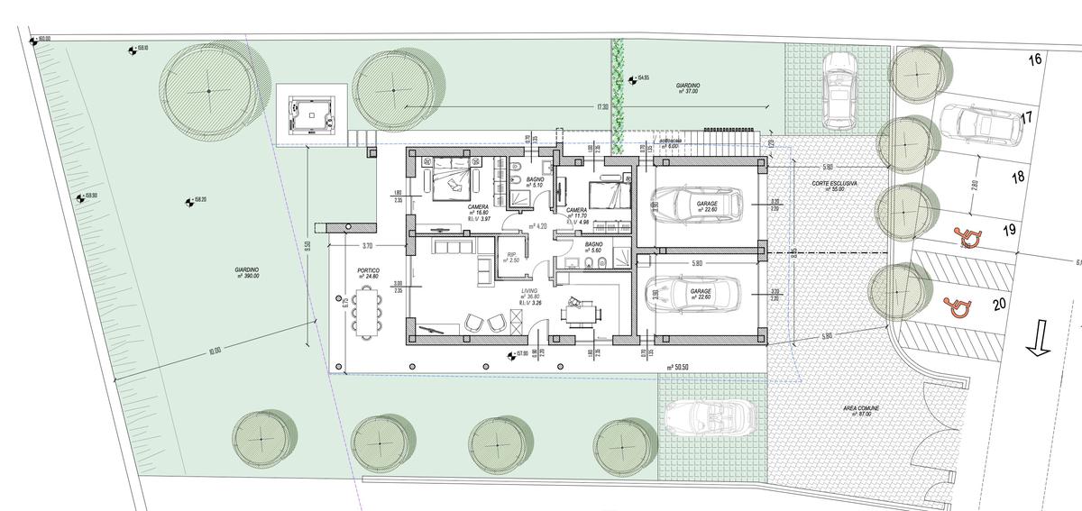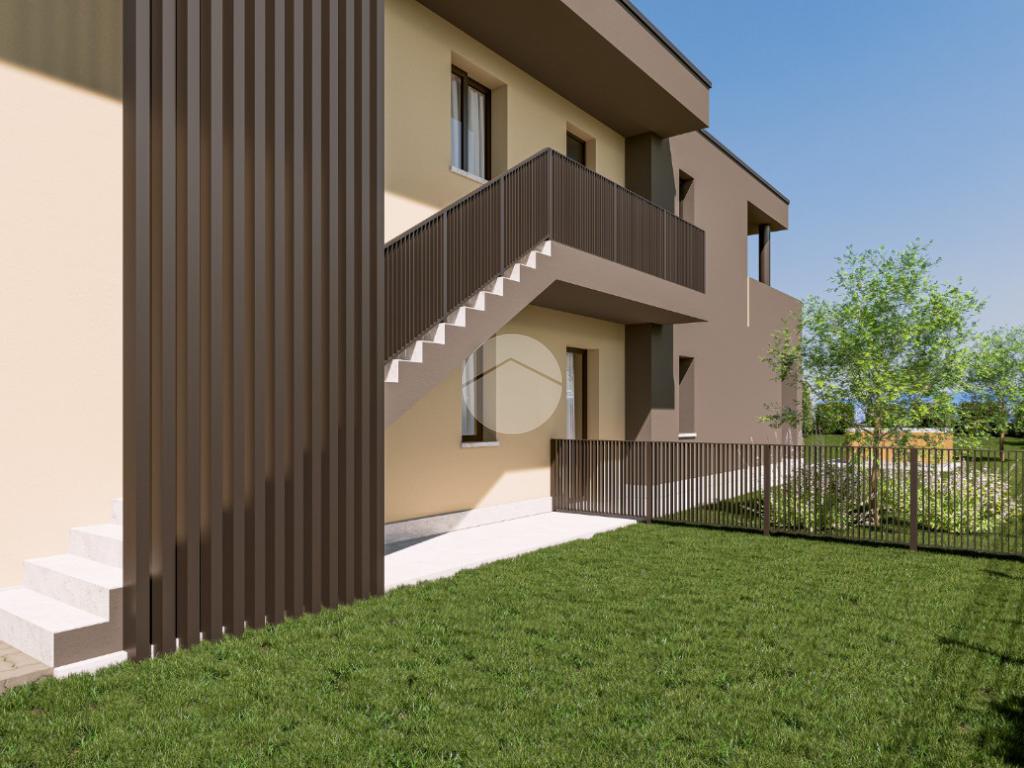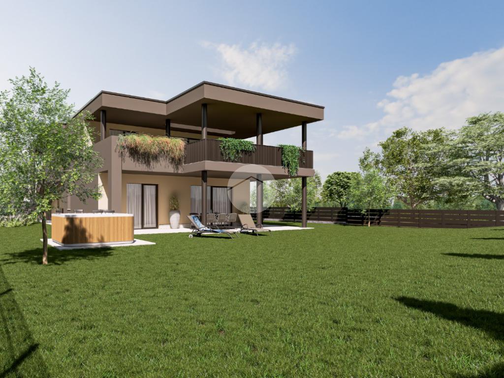 L’unità al piano terra gode di un terreno privato di quasi 400 mq ed è composto da una ampia zona giorno open-space caratterizzata da grandi finestre dalla doppia esposizione che donano luminosità agli ambienti; tutte le aperture affacceranno sul porticato coperto e sul giardino privato.