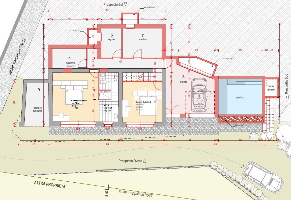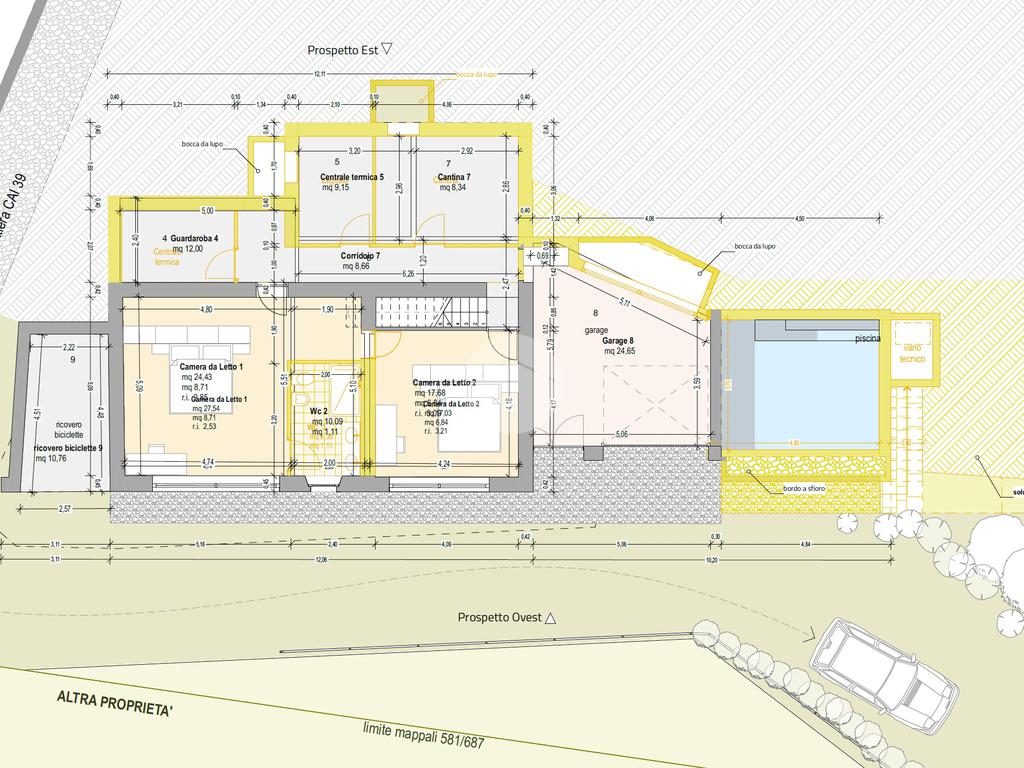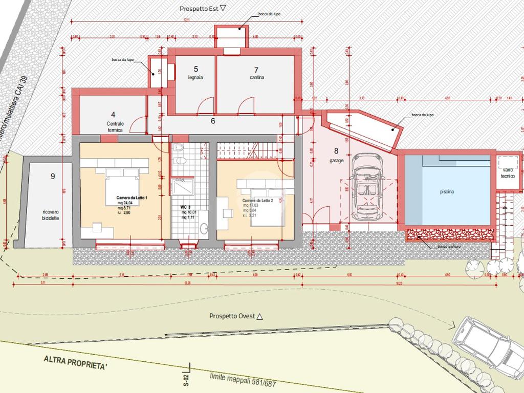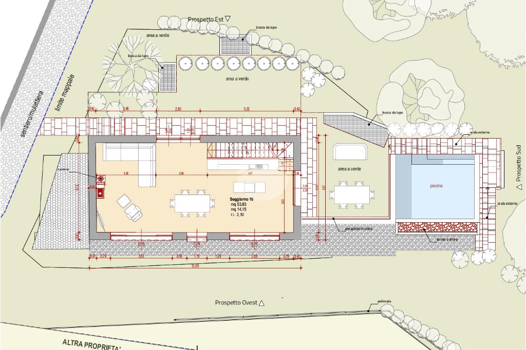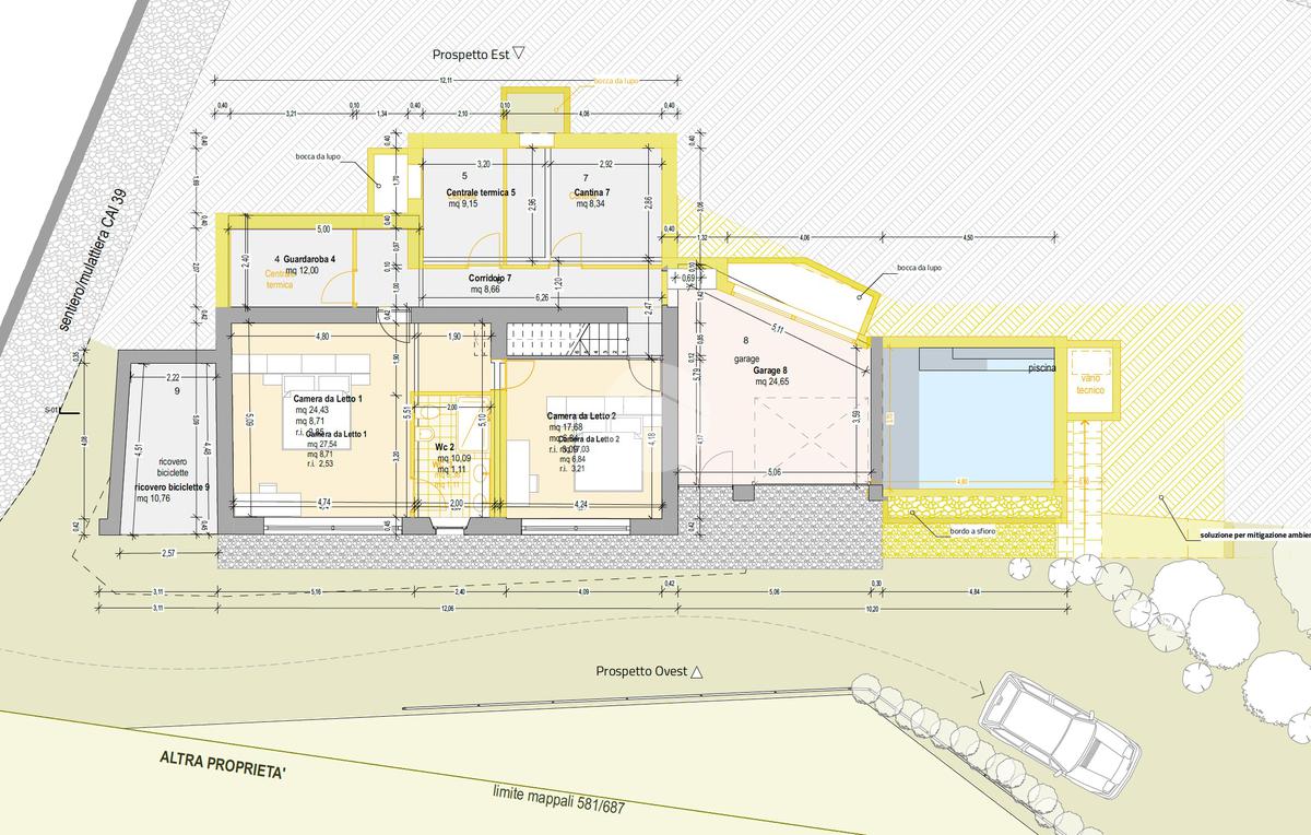 Al piano terra sono previste due camere da letto matrimoniali, due bagni (di cui uno padronale) e di vari locali accessori (centrale termica, ripostiglio e locali tecnici). Un piccolo garage può ospitare un’utilitaria, unico mezzo per arrivare al rustico attraverso i vicoli e le mulattiere caratteristiche della contrada.